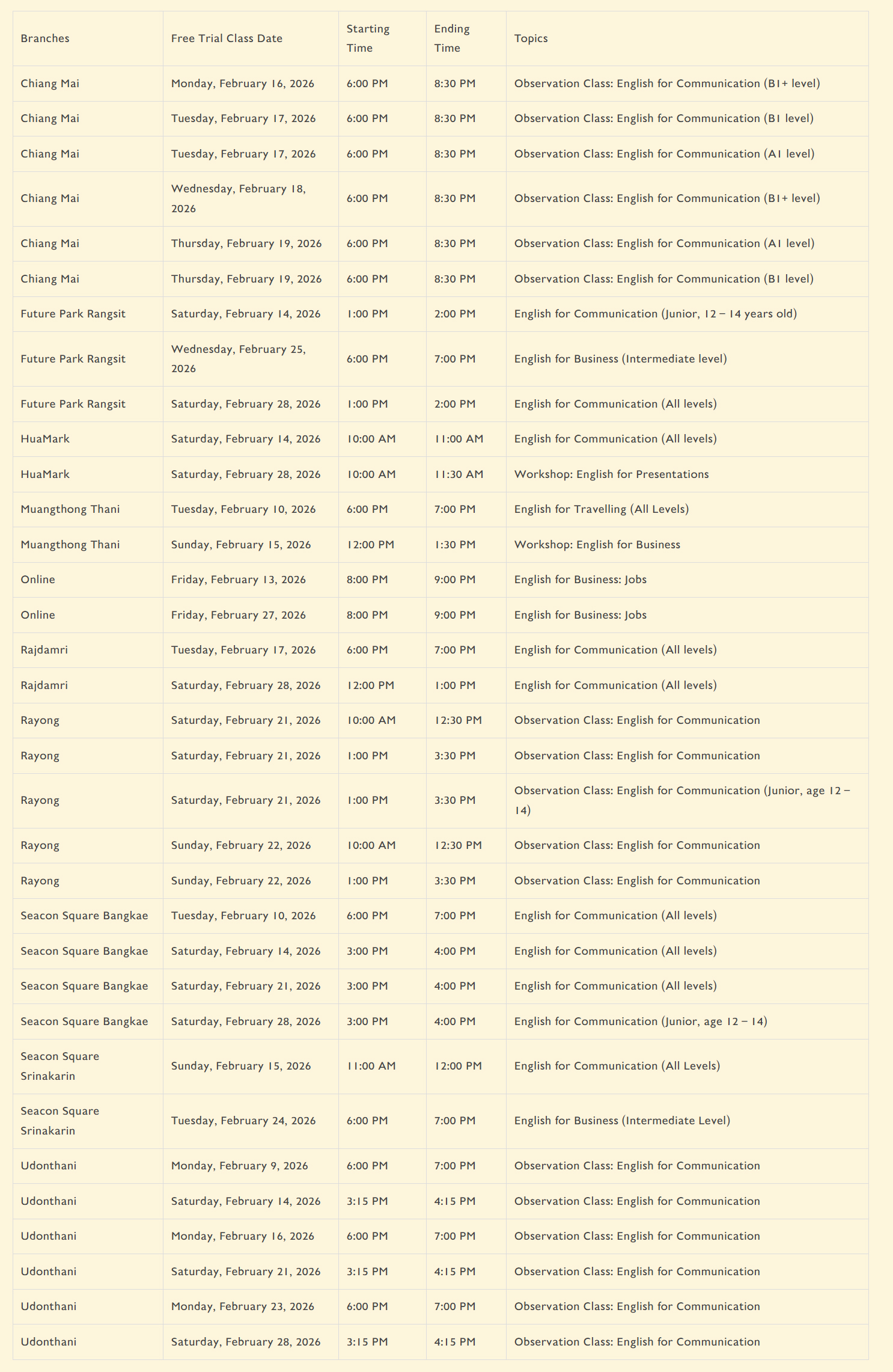 RayongSaturday, February 21, 20261:00 PM3:30 PMObservation Class: English for Communication